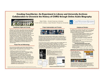 This is a poster that was presented at the 2009 Research ShowCASE poster session. It addresses the CASE Stories project that originated in the Kelvin Smith Library to highlight historic leadership at Case Western Reserve University through a series of podcasts that combine the best features of oral history, knowledge capture and the web 2.0 environment.
